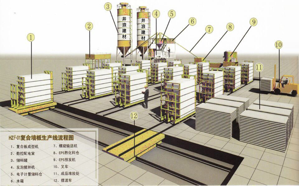 井浪輕質(zhì)復(fù)合墻板生產(chǎn)線:高速裝模--改良攪拌--自動(dòng)振搗--養(yǎng)護(hù)--機(jī)械拆模--包裝--入庫--出庫--運(yùn)輸。
